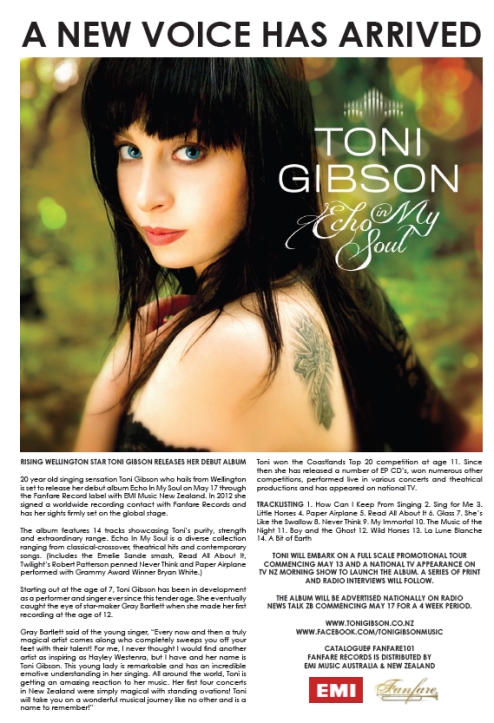It is with great pleasure to announce that Toni's debut Album, "Echo in my Soul" has just been released and is available by contacting me directly for a personally autographed CD for only $15 (plus post and packaging) or by clickiing the following links: